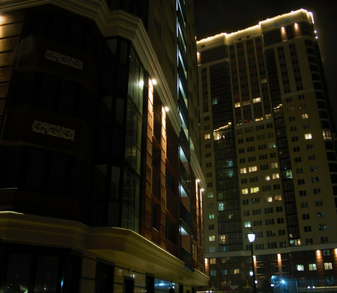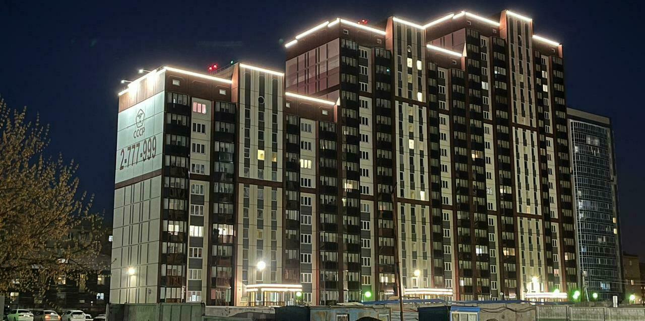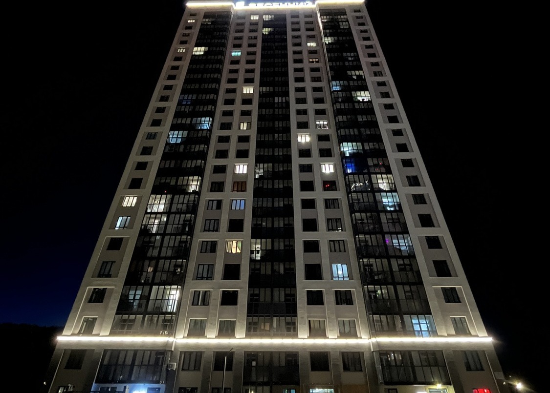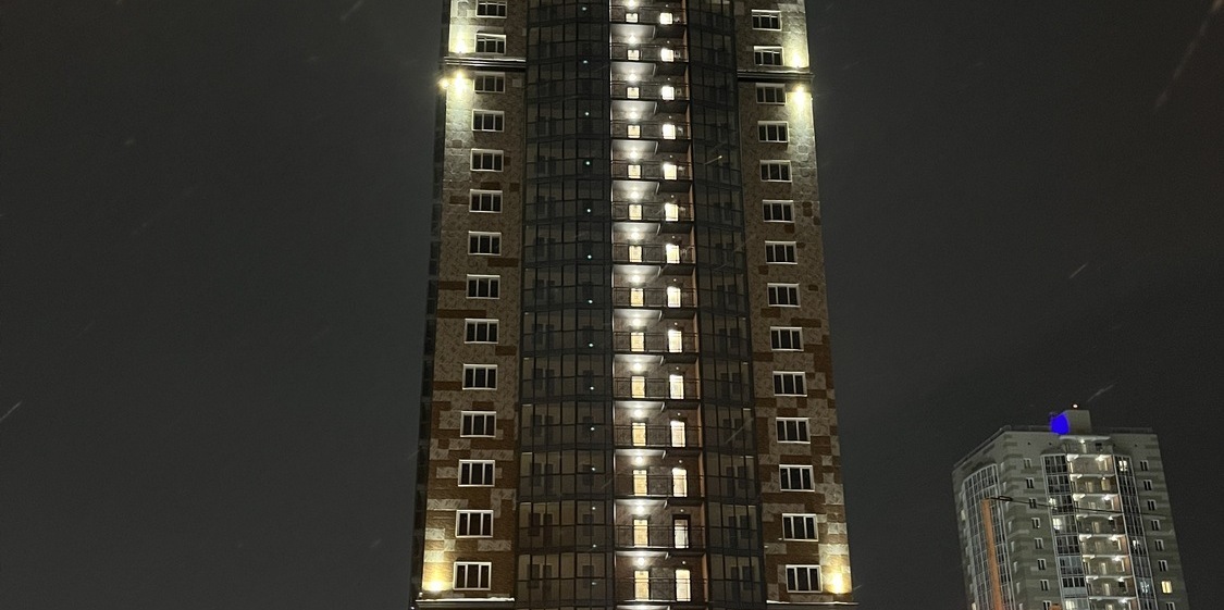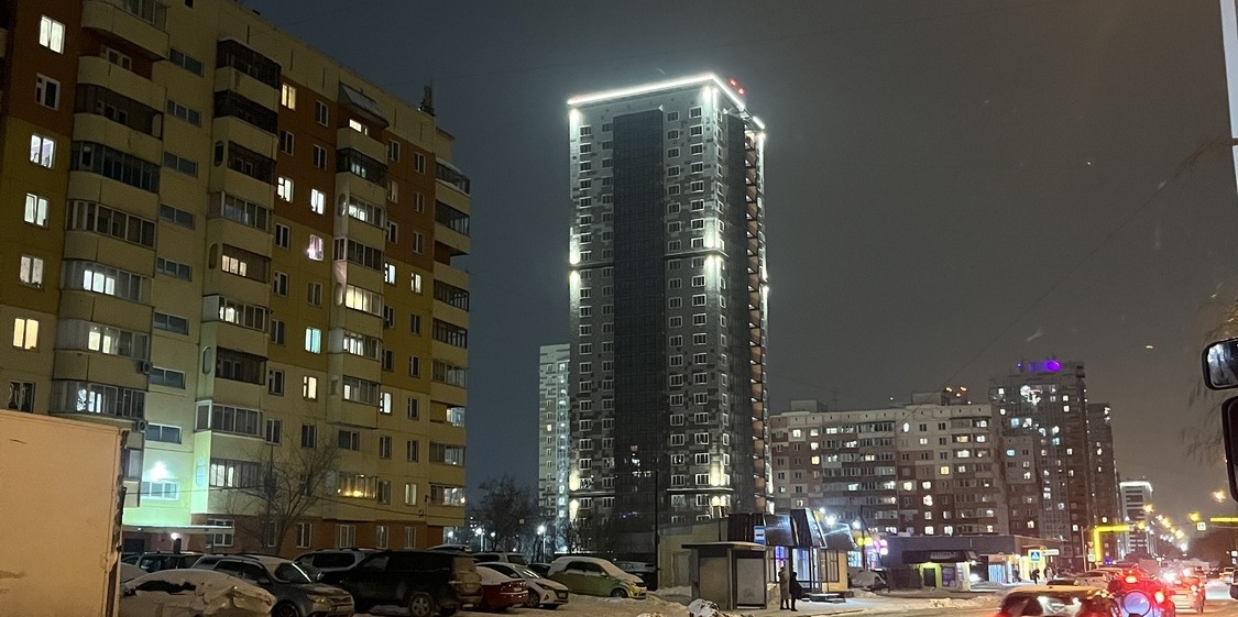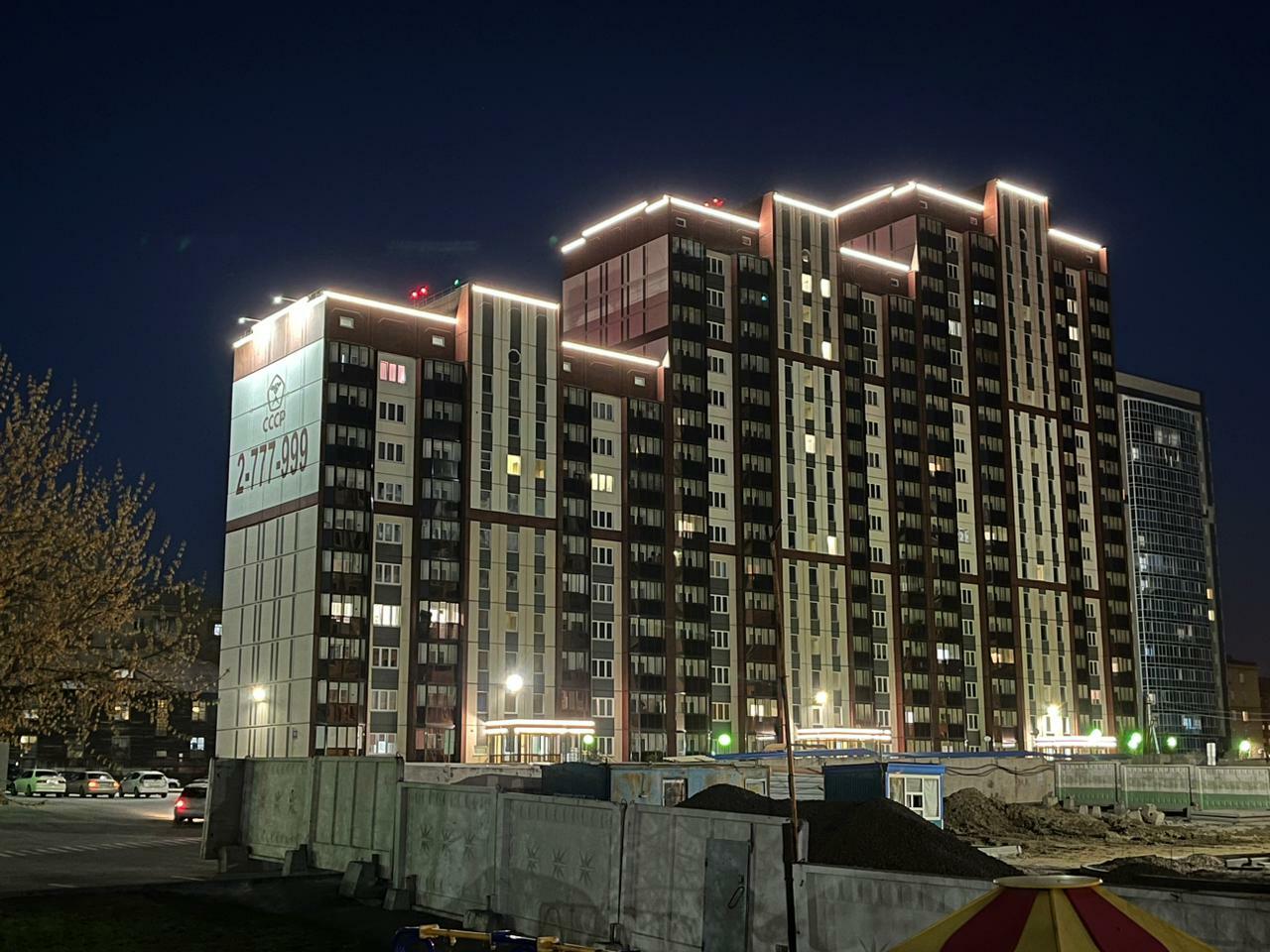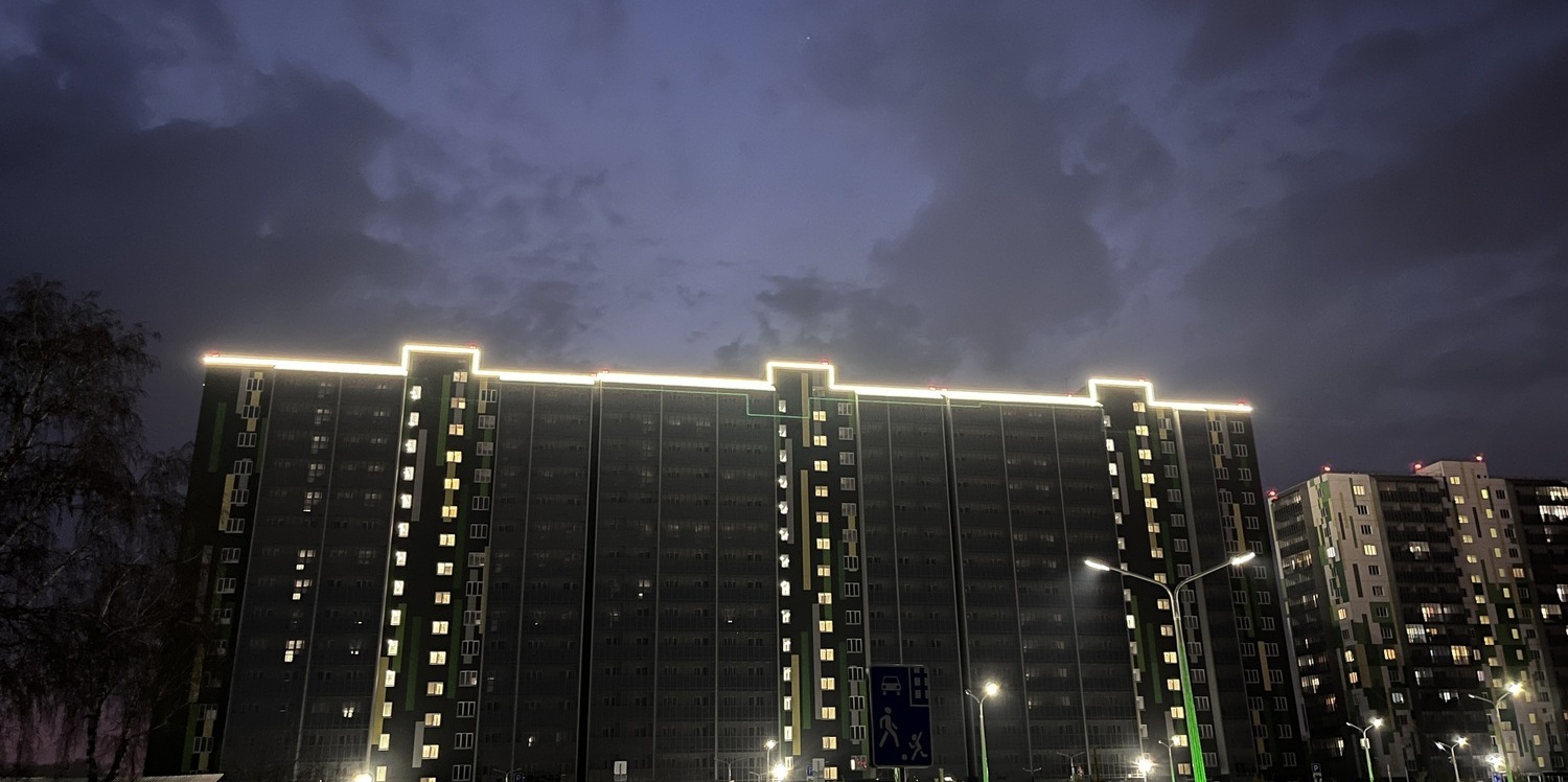 Специалисты нашей компании разработали проект и выполнили монтажные работы по системе архитектурного освещения. Основная сложность была в уникальной объемной буквенной композиции на кровле 26 этажного здания. Надпись высотой более 4 метров и длиной более 17 метров видна практически из любой точки Первомайского района.