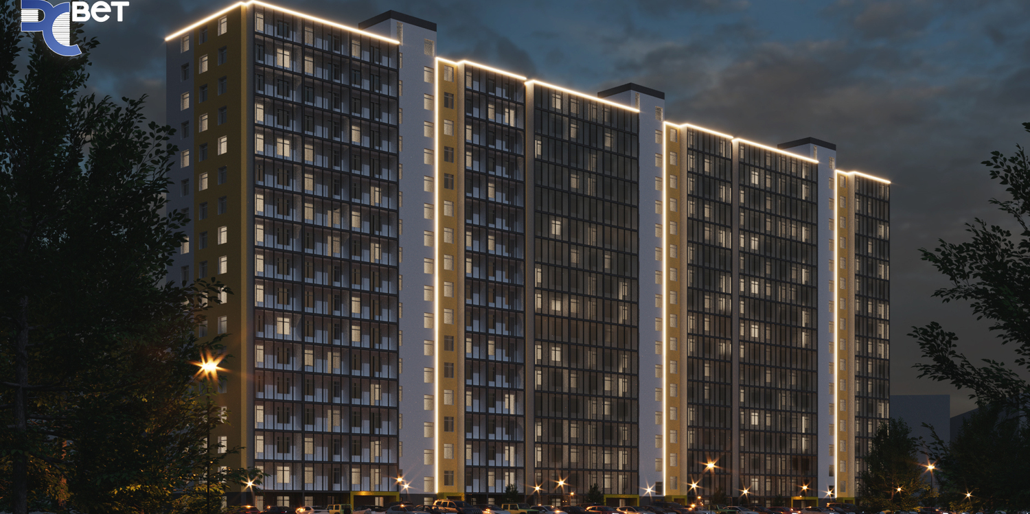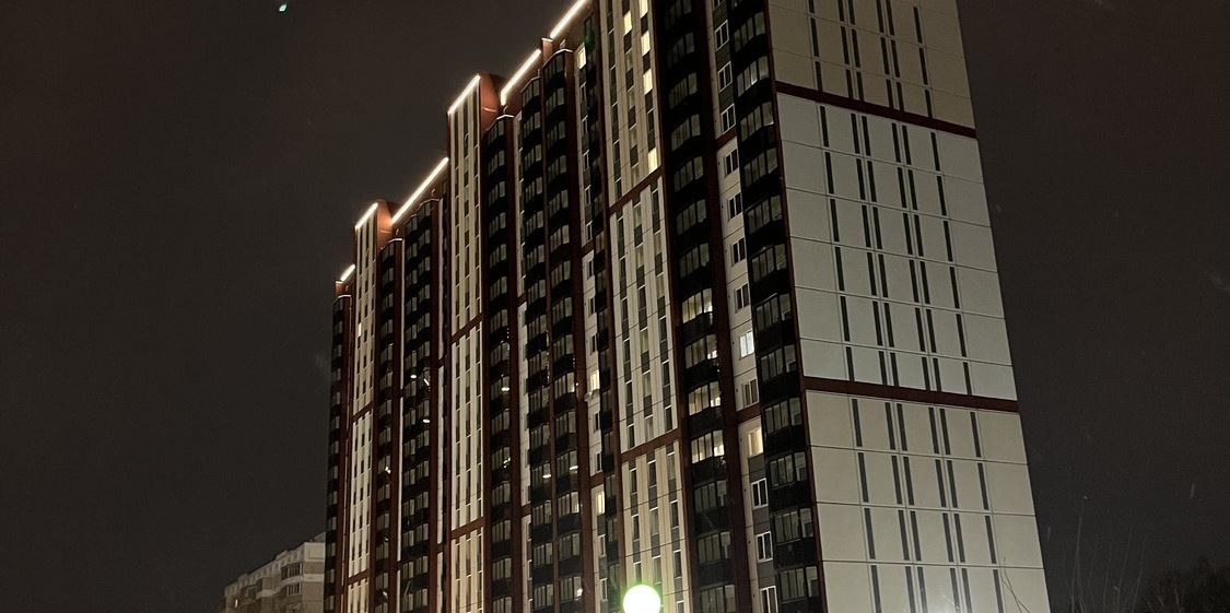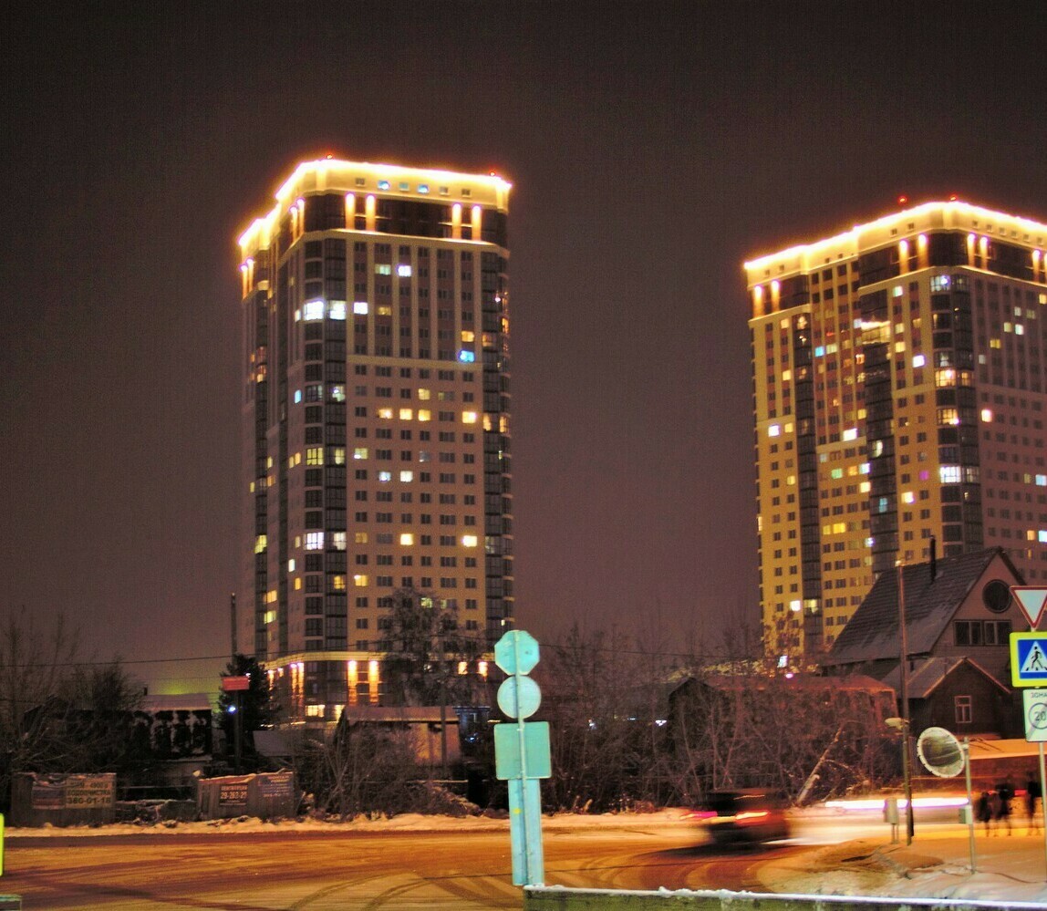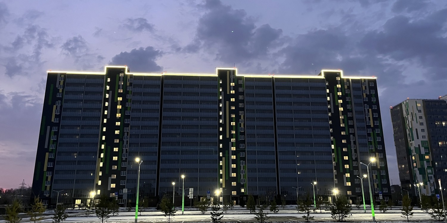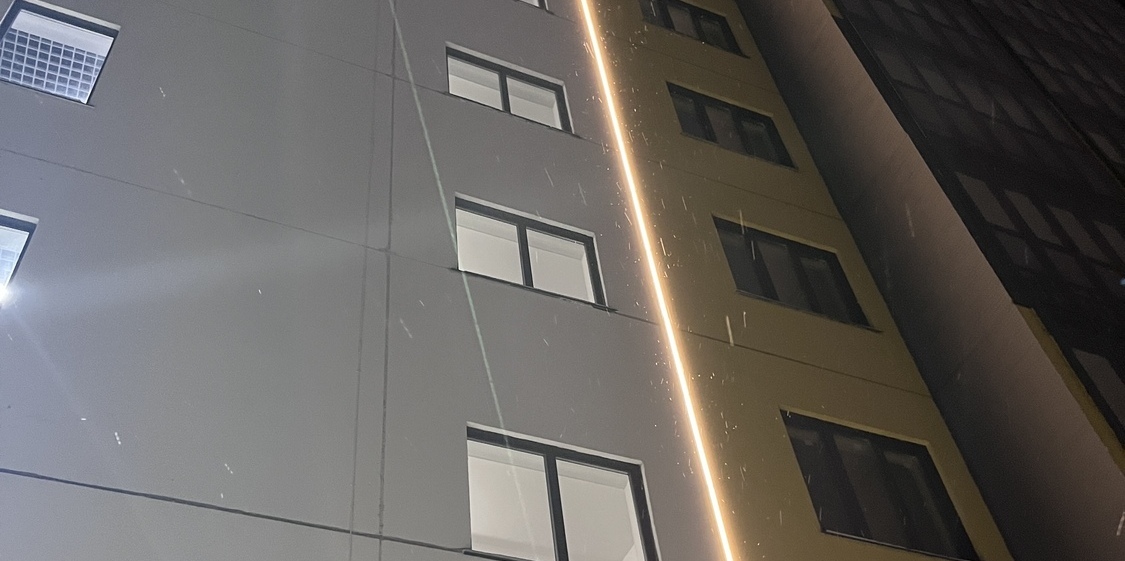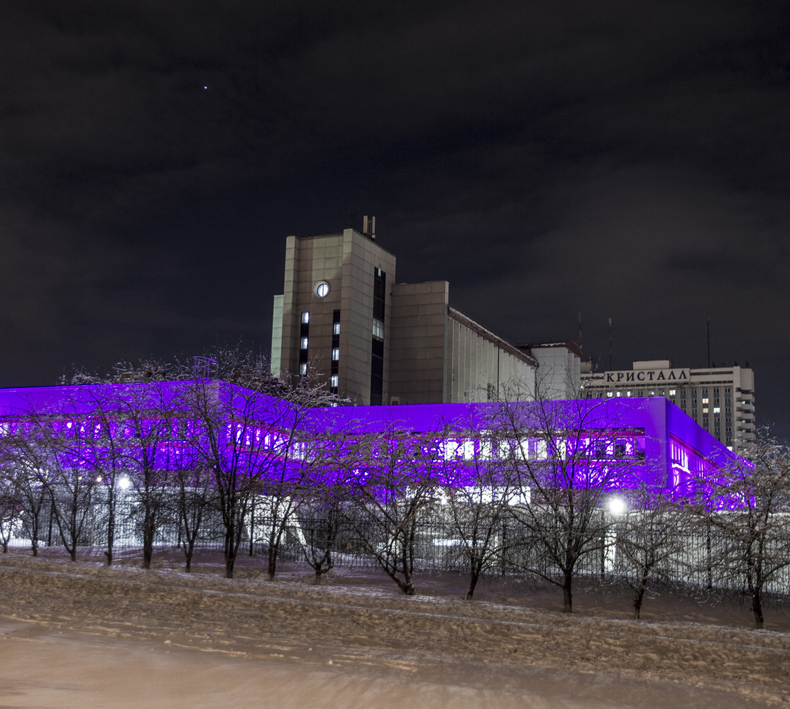 Специалисты нашей компании разработали проект и выполнили монтажные работы по системе архитектурного освещения. Основная сложность была в уникальной объемной буквенной композиции на кровле 26 этажного здания. Надпись высотой более 4 метров и длиной более 17 метров видна практически из любой точки Первомайского района.