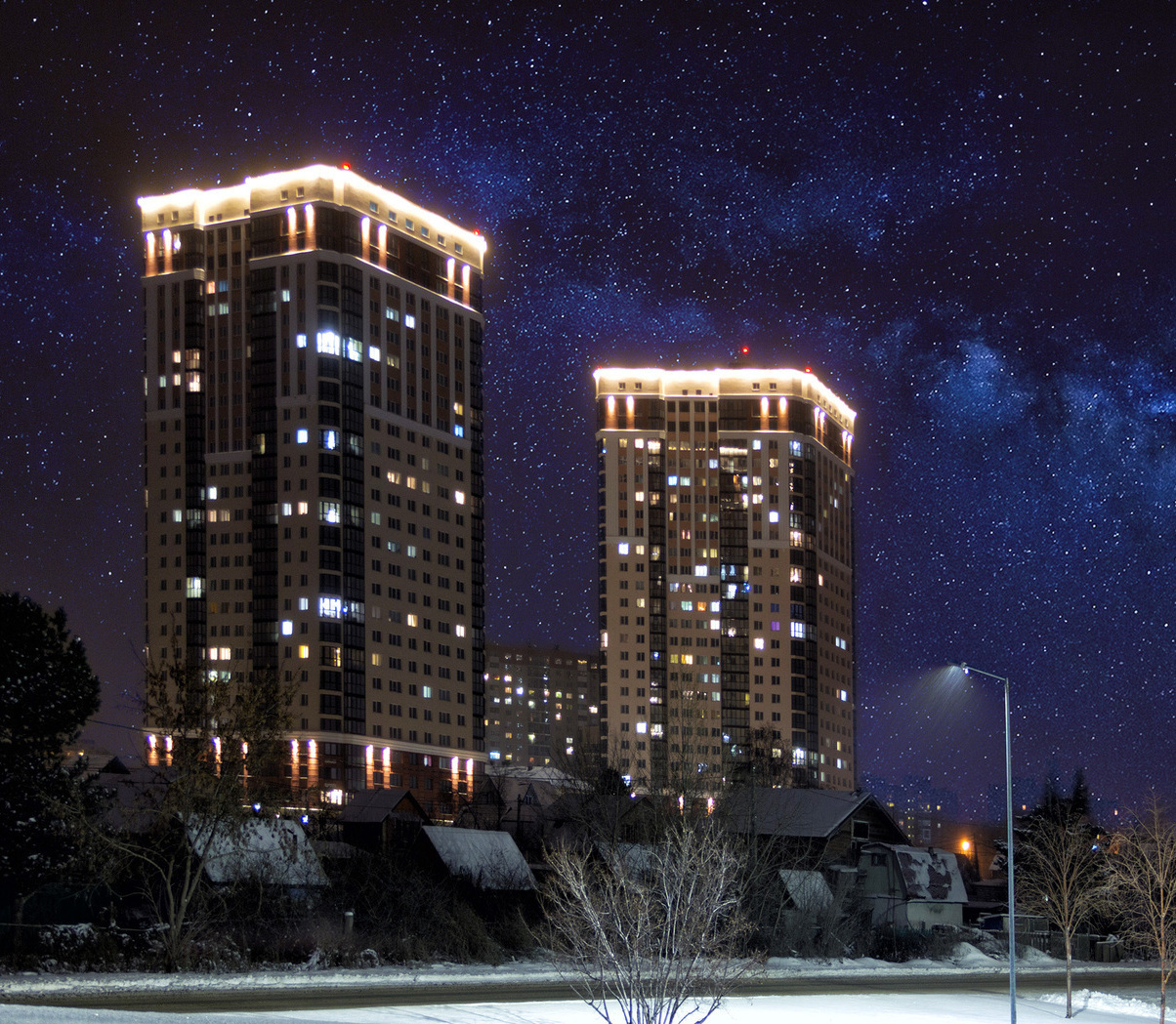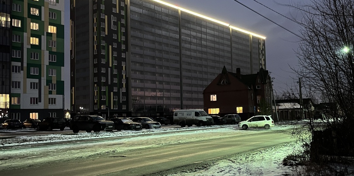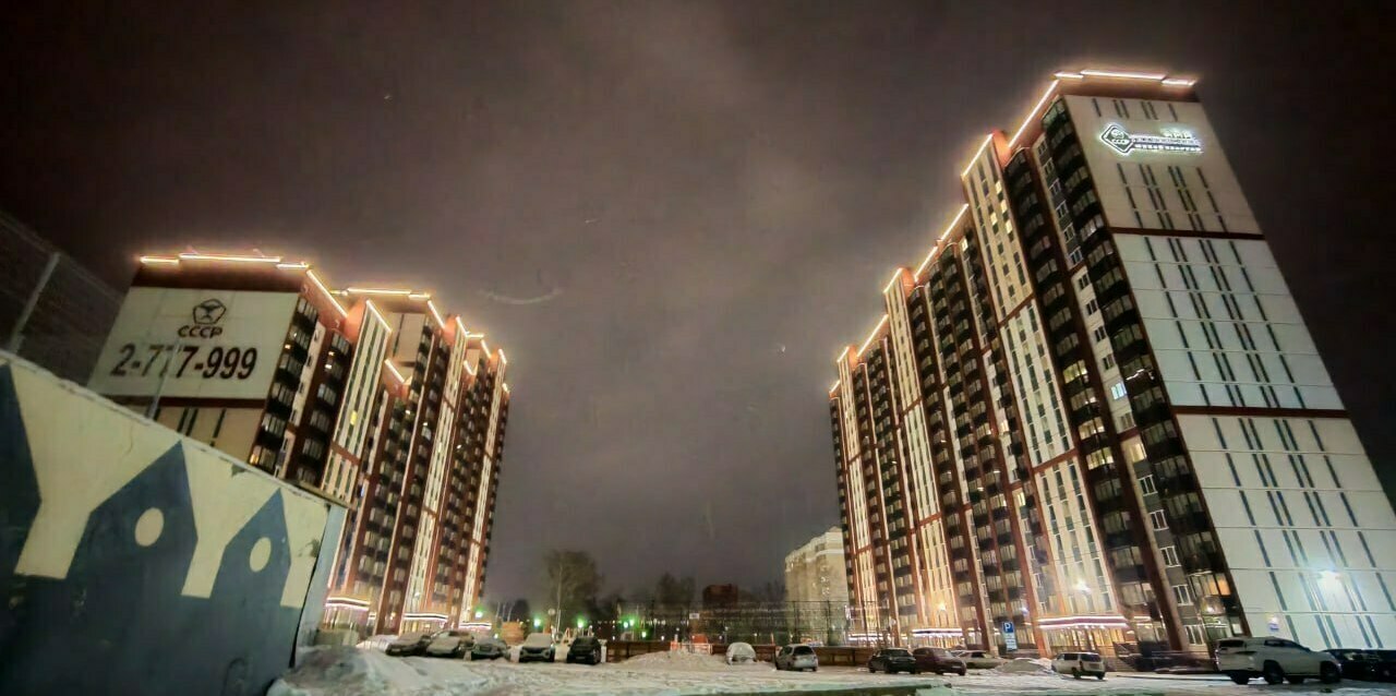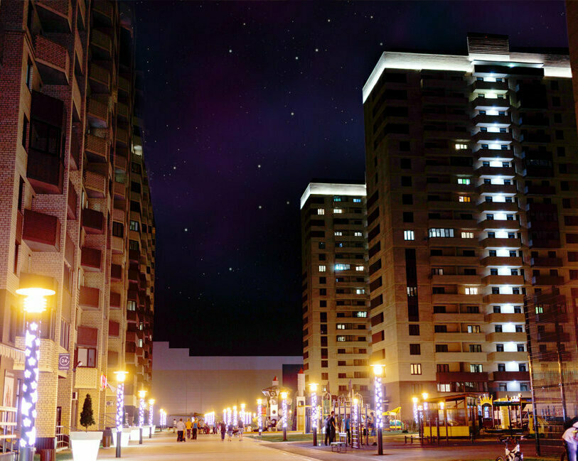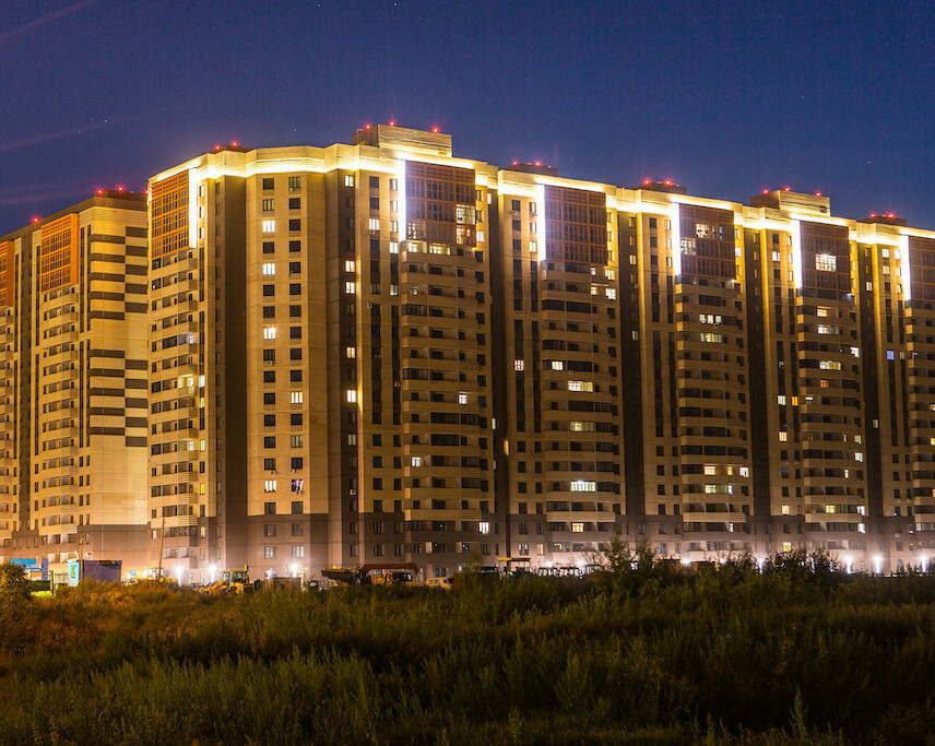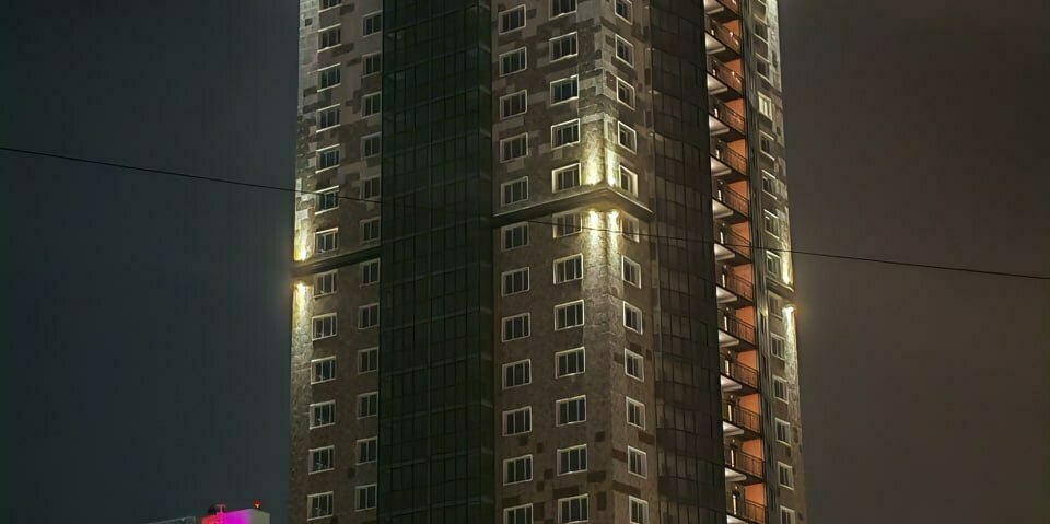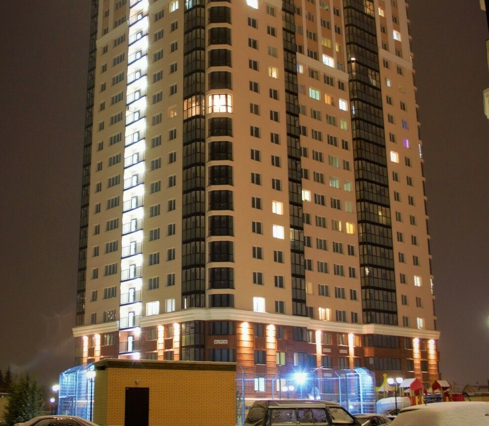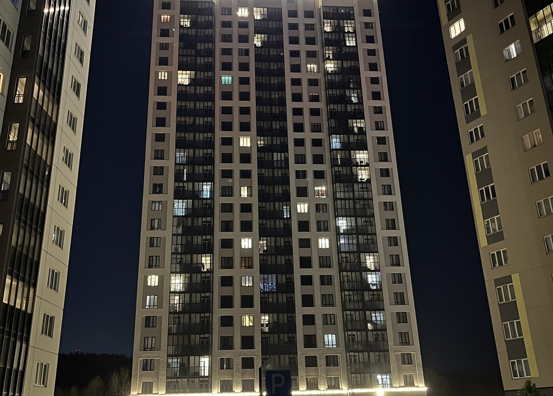 Специалисты нашей компании разработали проект и выполнили монтажные работы по системе архитектурного освещения. Основная сложность была в уникальной объемной буквенной композиции на кровле 26 этажного здания. Надпись высотой более 4 метров и длиной более 17 метров видна практически из любой точки Первомайского района.