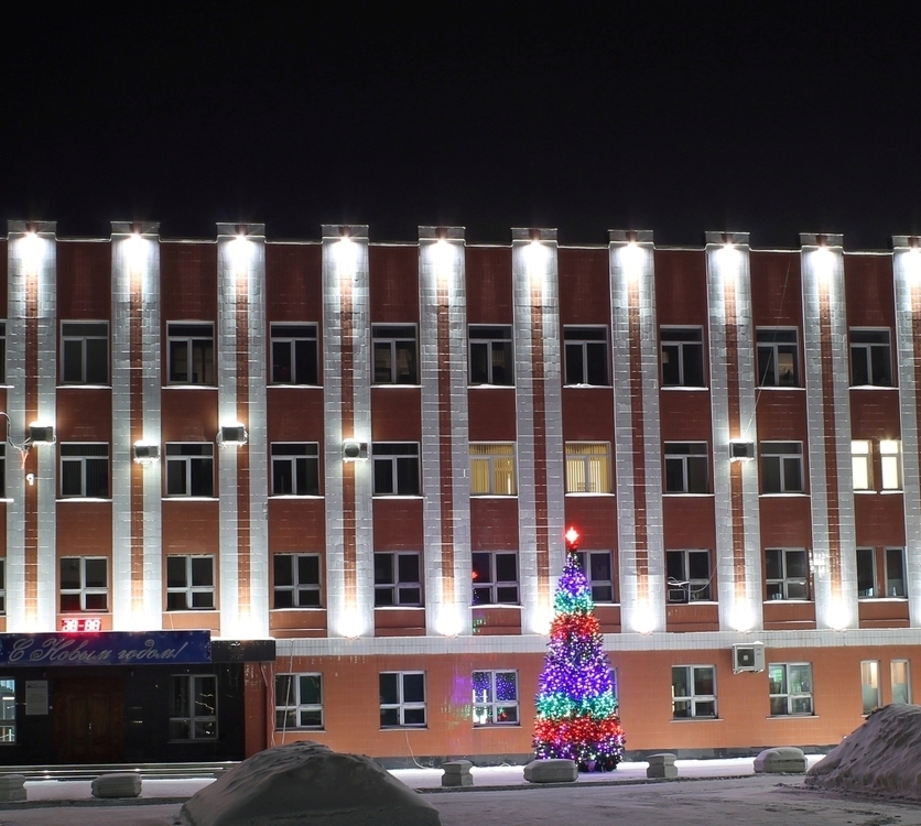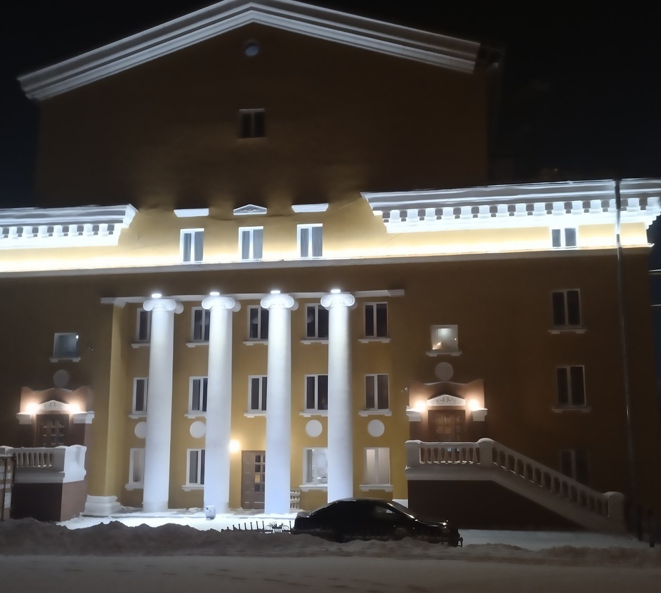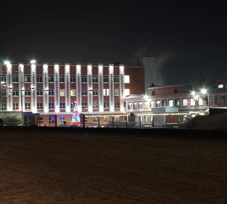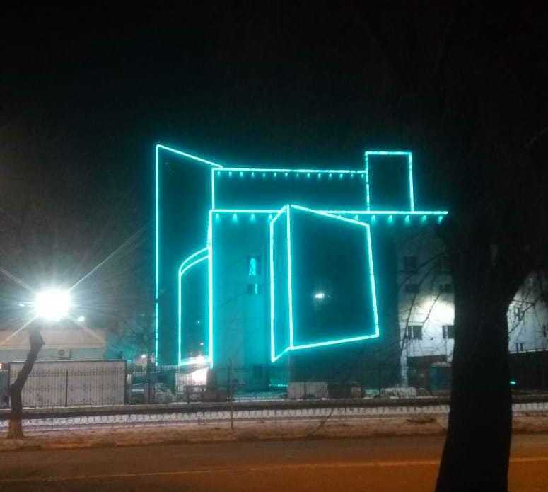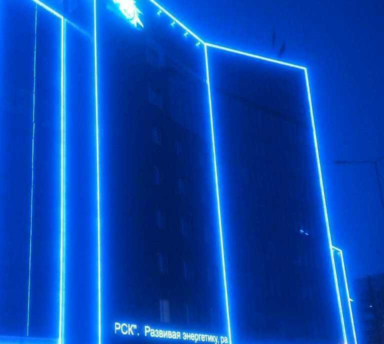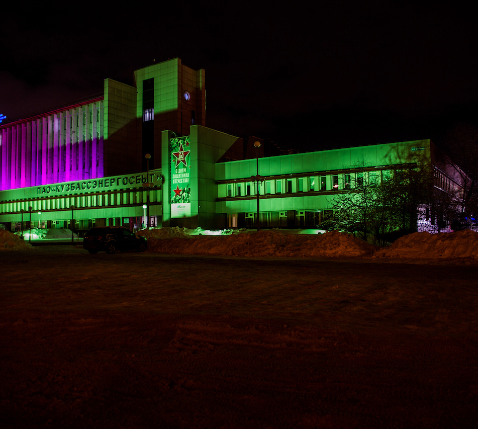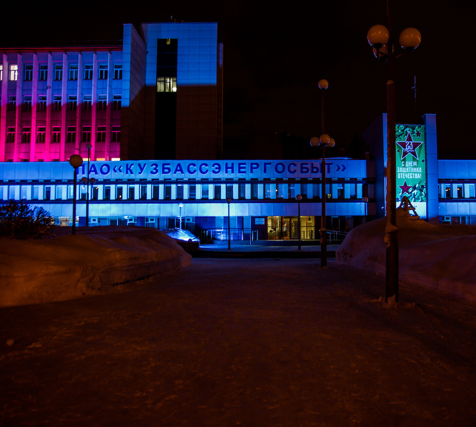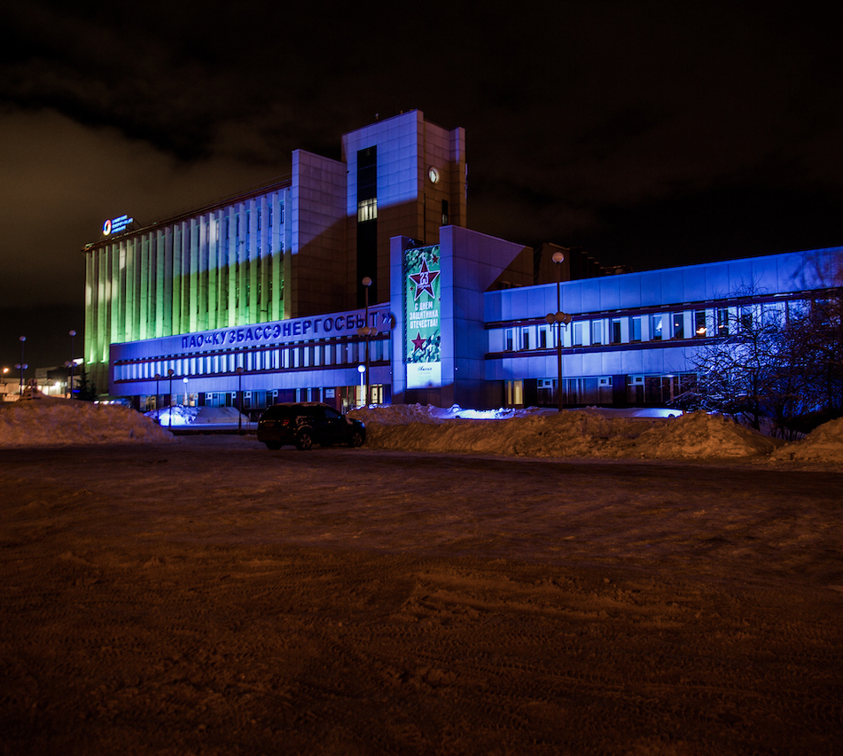Объект в г. Кемерово, главный офис ПАО "Кузбассэнергосбыт". Динамическая подсветка мощными прожекторами с управлением по протоколу DMX512.