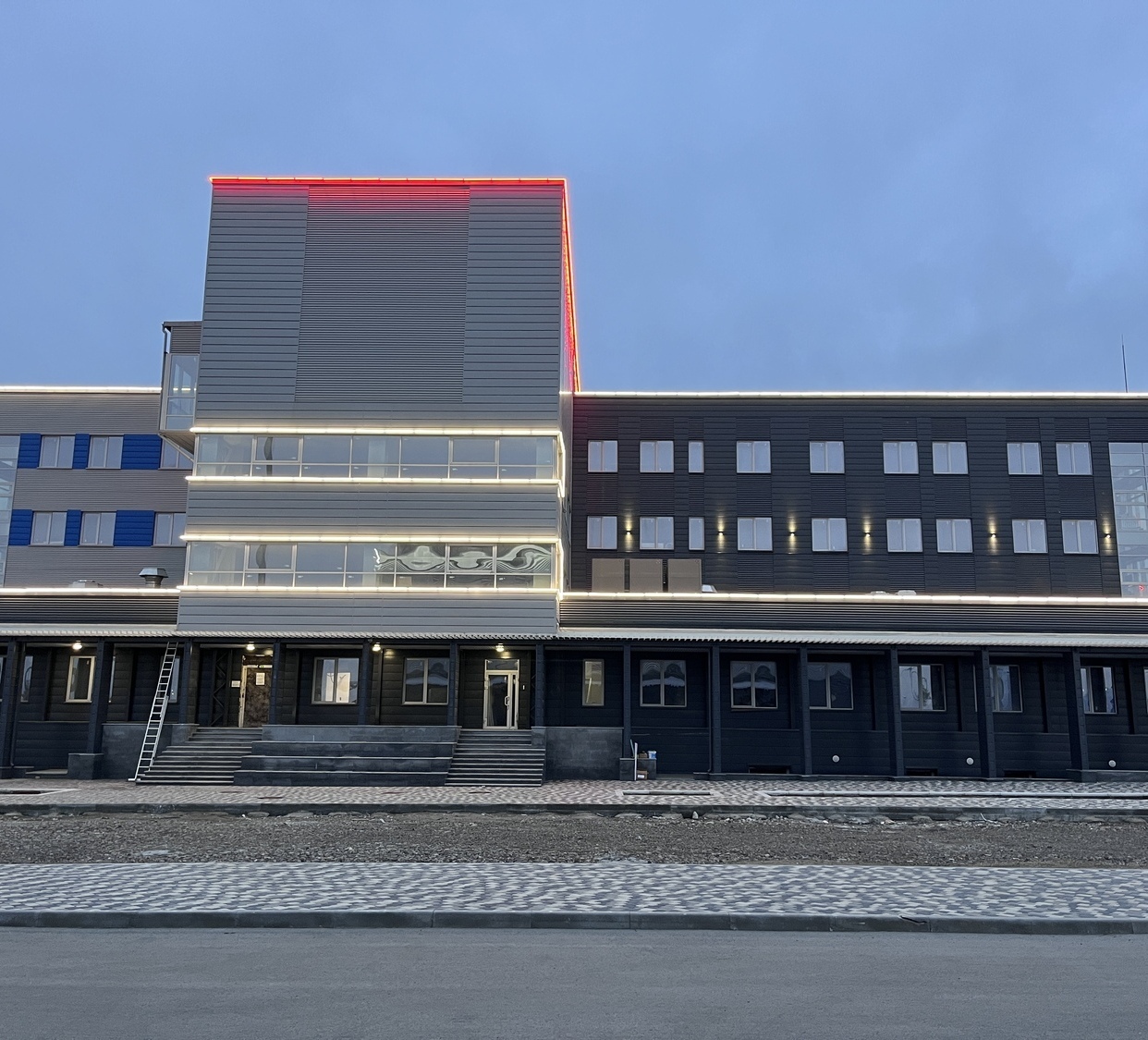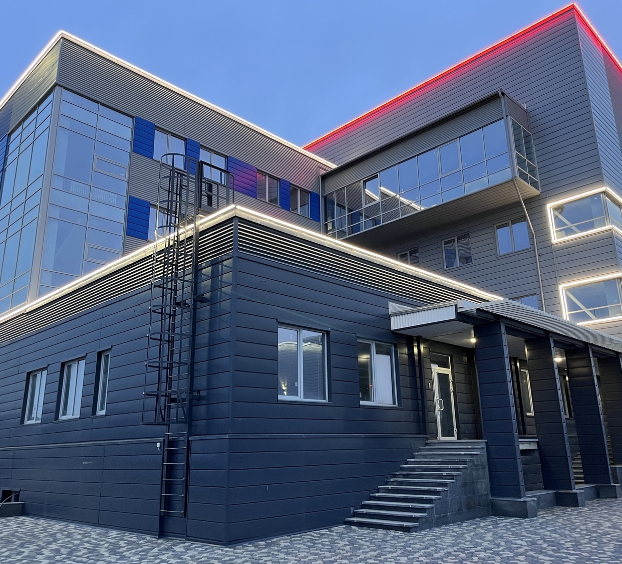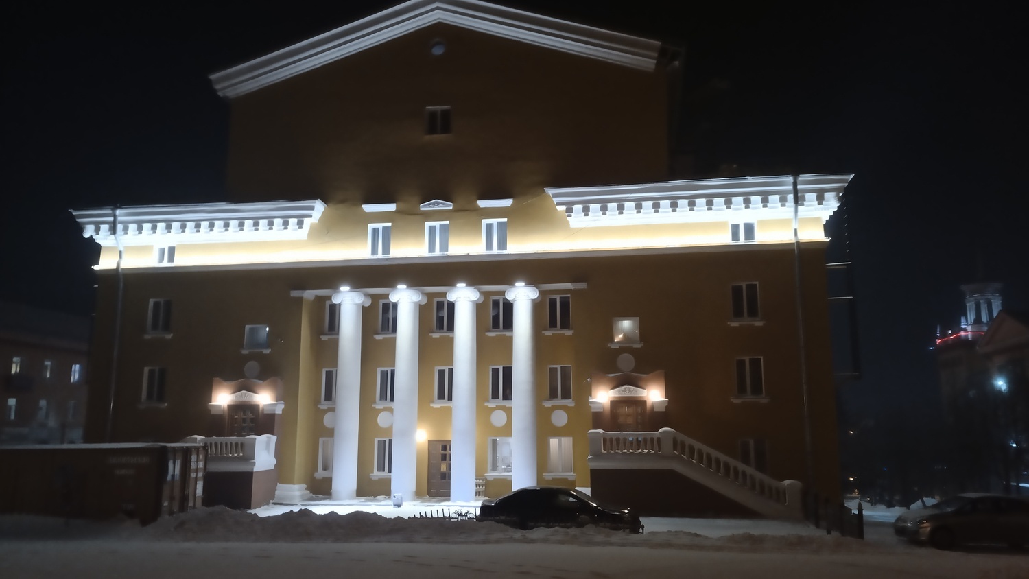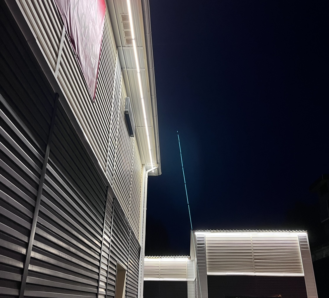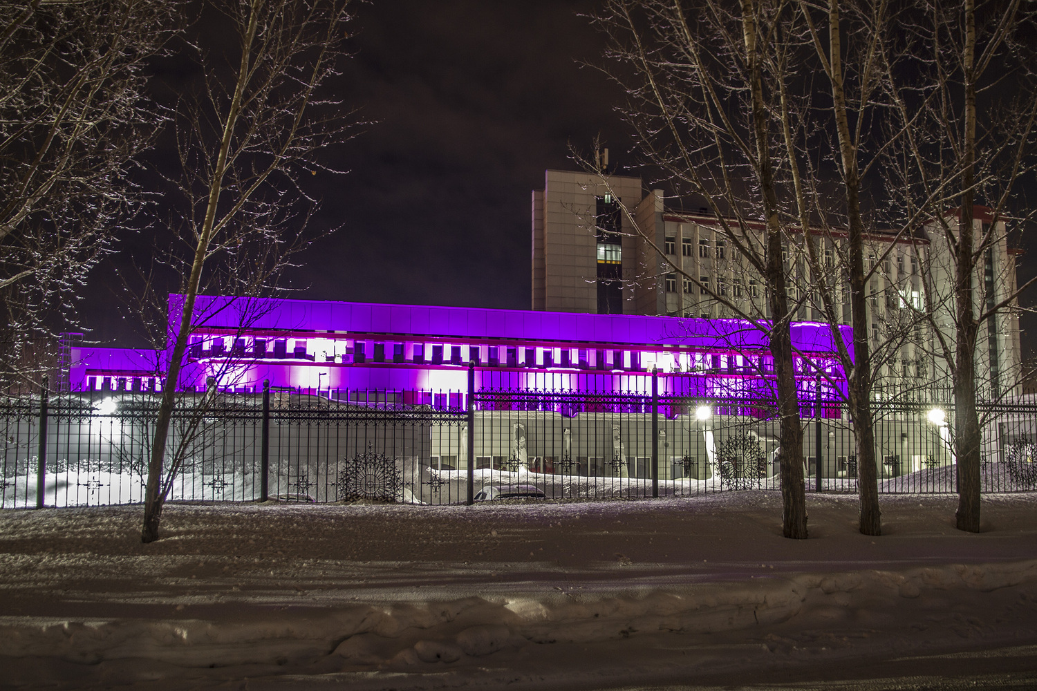 Объект в г. Кемерово, главный офис ПАО "Кузбассэнергосбыт". Динамическая подсветка мощными прожекторами с управлением по протоколу DMX512.