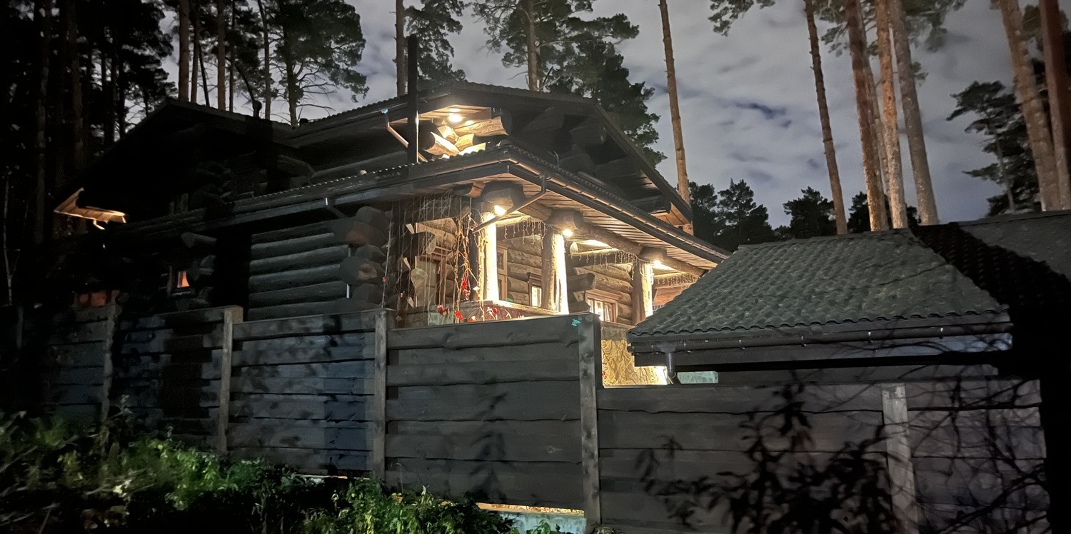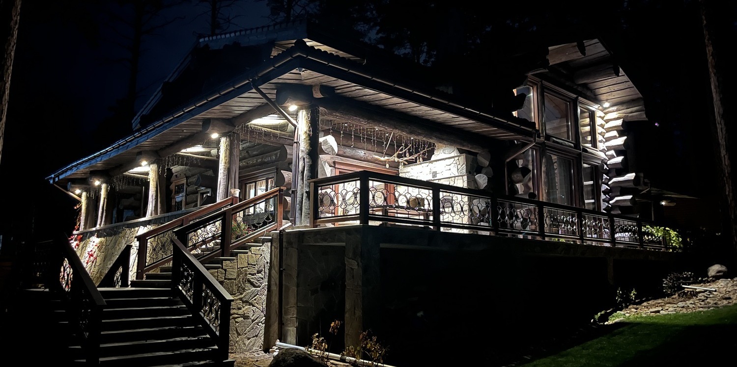 Специалисты нашей компании разработали проект архитектурного освещения и выполнили работы по монтажу. Коттедж из бревна большого диаметра – элита частного домостроения. Рубка сруба из обтёсанных вручную стволов обеспечивает зданию некую брутальность. Получилась красивая сказка.