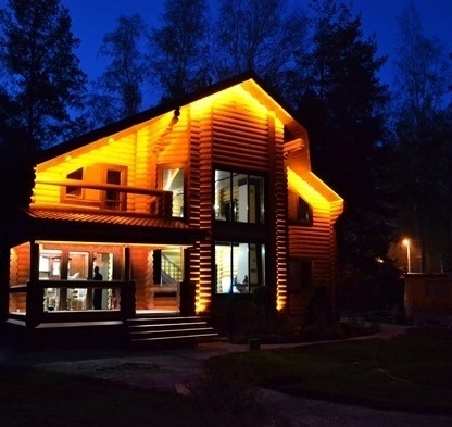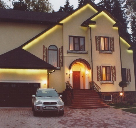 Далее выполняем все установочные, электромонтажные, наладочные работы и включаем фасадное освещение вашего дома.