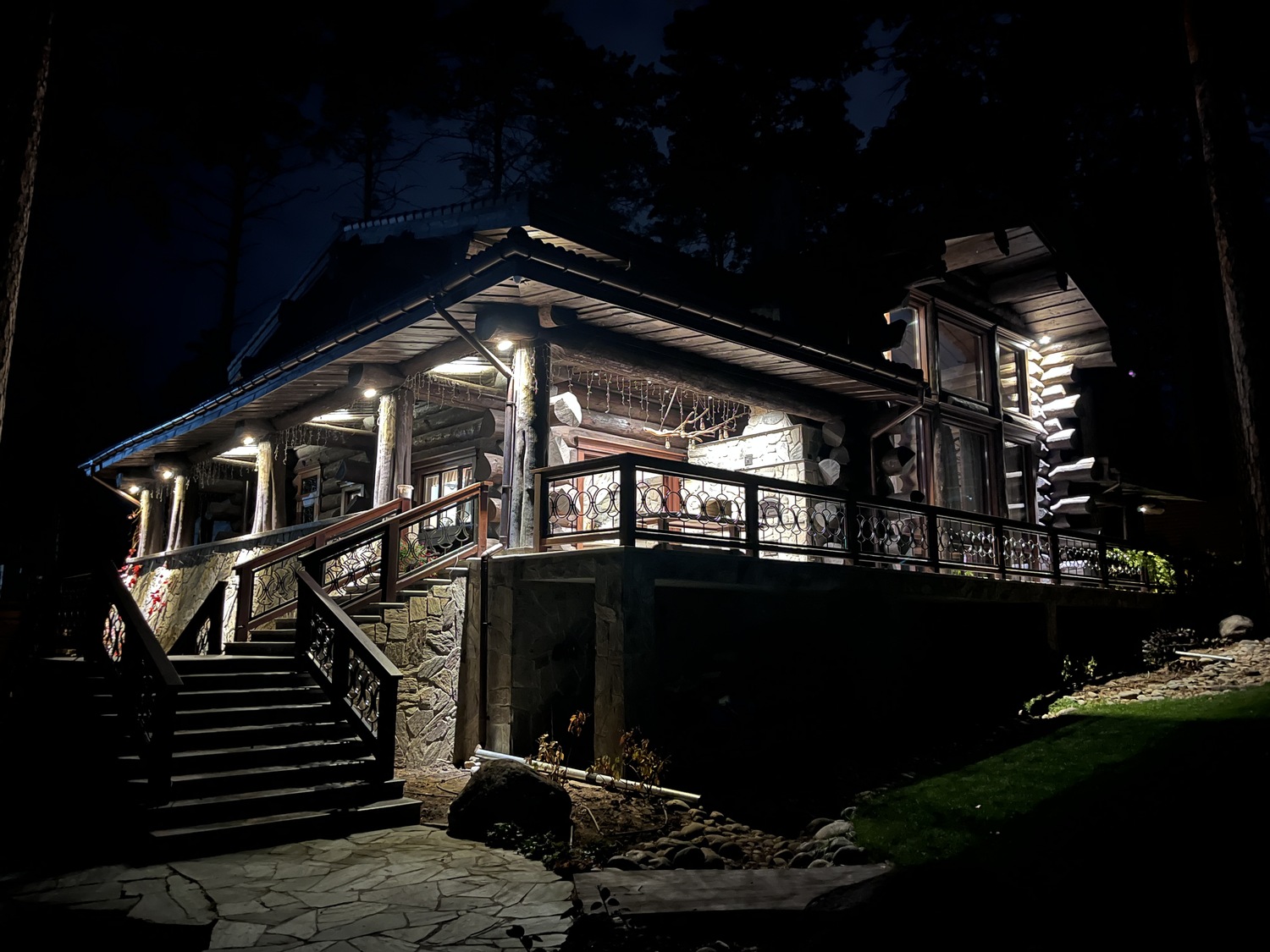 Коттедж из бревна большого диаметра – элита частного домостроения. Рубка сруба из обтёсанных вручную стволов обеспечивает зданию некую брутальность. Специалисты нашей компании разработали проект и выполнили монтажные работы по системе архитектурного освещения. Получилась красивая сказка.