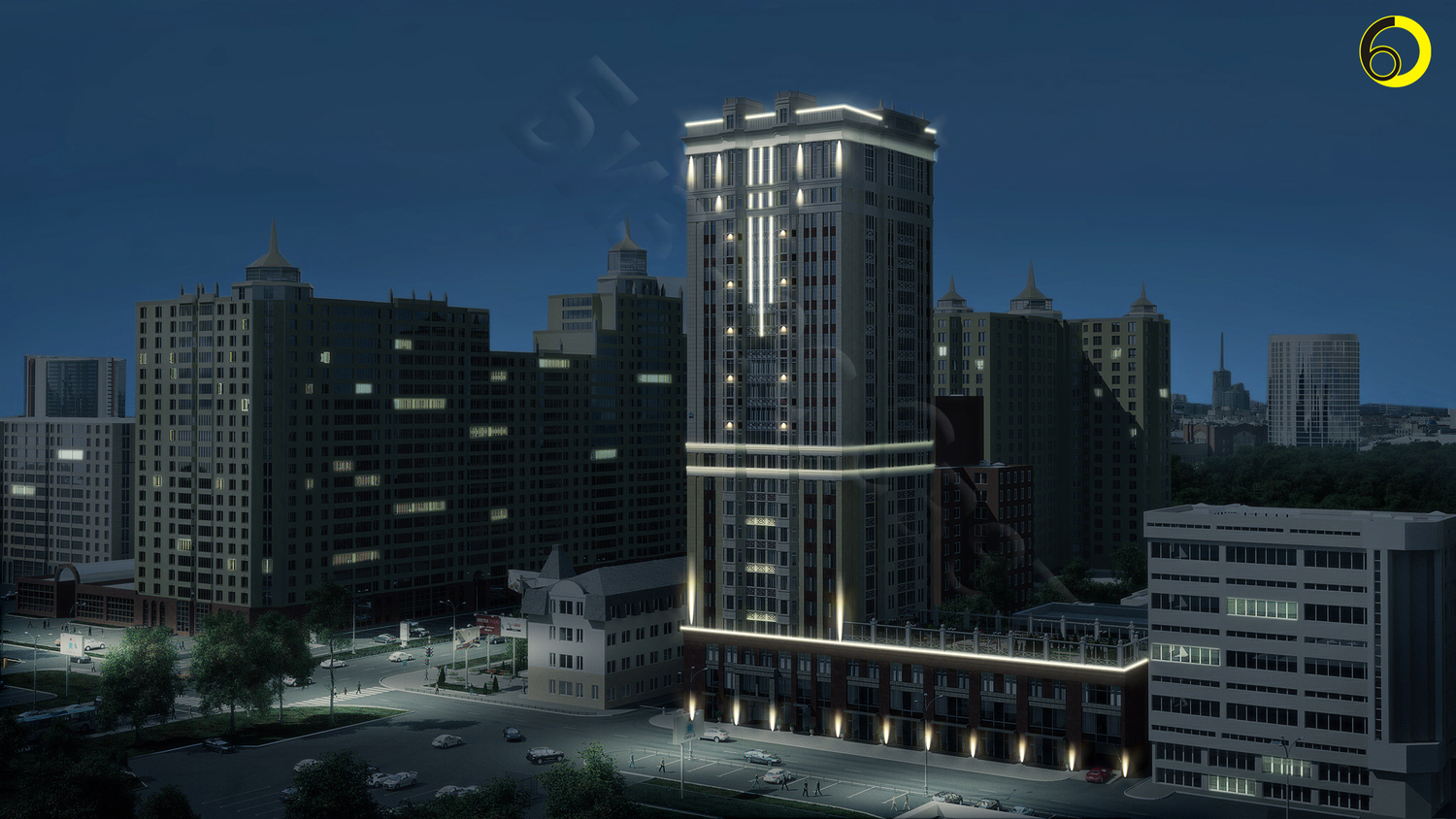 При желании заказчика мы можем воссоздать вокруг его здания окружающую реальную застройку и ландшафт. Исходя из этого можно правильно подбирать ракурсы, с которых фасадная подсветка здания будет выглядеть наиболее эффектно. В этом случае, проект архитектурного освещения будет наиболее привлекательным, точным и полным.